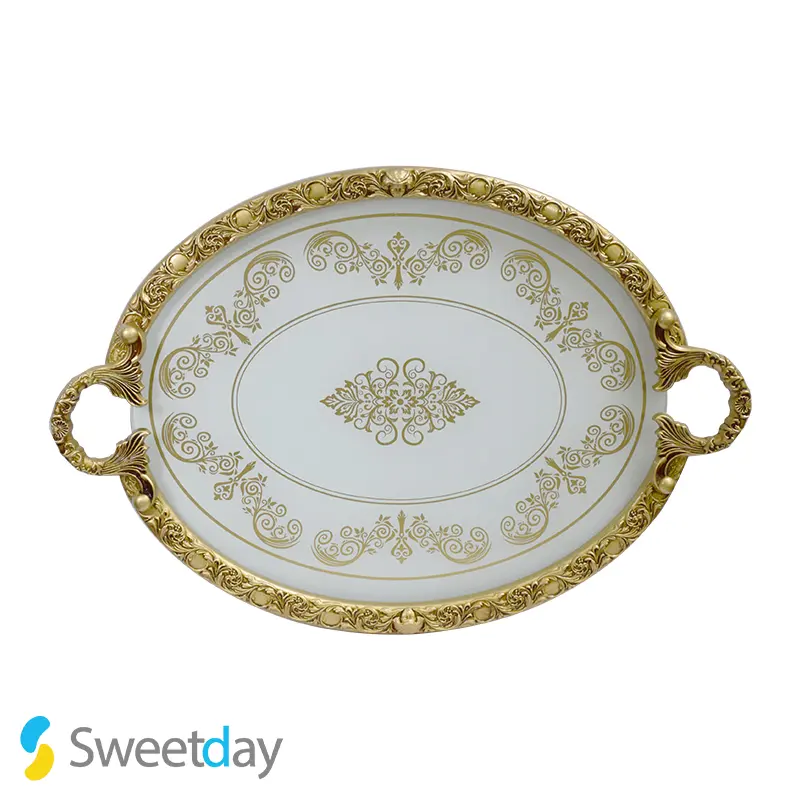 قاب، پایهها و دستههای این سینی از آلومینیوم طلایی مقاوم ساخته شدهاند تا علاوه بر ظاهر جذاب، دوام و استحکام بالایی هم فراهم شود. طراحی بیضی شکل محصول فضای کافی برای چیدمان انواع ظروف پذیرایی، شیرینی، دسر و نوشیدنیها ایجاد میکند.